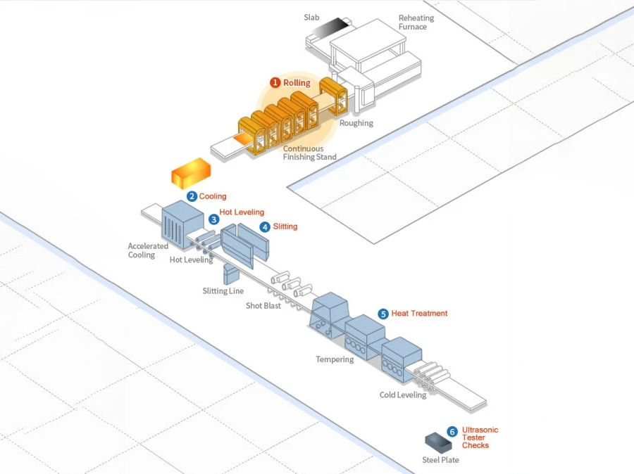 • 01.Rolling: 4-high reversible finishing mill (7000t max load) reduces internal defects in thick plates; automatic gauge & shape control cut thickness deviation and enhance flatness.