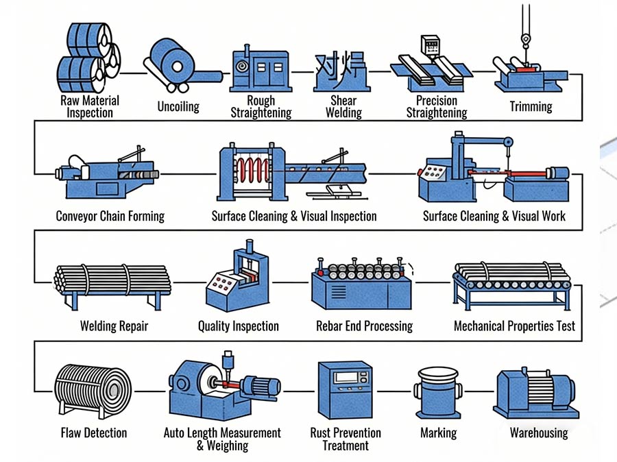 • 05.Straightening & Finishing: Automatic straightening machines eliminate bending caused by rolling and cooling, ensuring straightness and straight-line performance. Surface oxide scale and burrs are removed to improve surface quality and appearance.